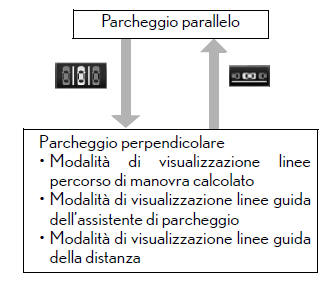 - Ad ogni selezione, la schermata dell'assistente di parcheggio parallelo varia, come segue: