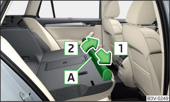 - Per il montaggio inserire le cavità sull'alloggiamento A negli alloggiamento degli schienali dei sedili posteriori e spostare l'alloggiamento in direzione opposta a quella della freccia 1 fino all'arresto.